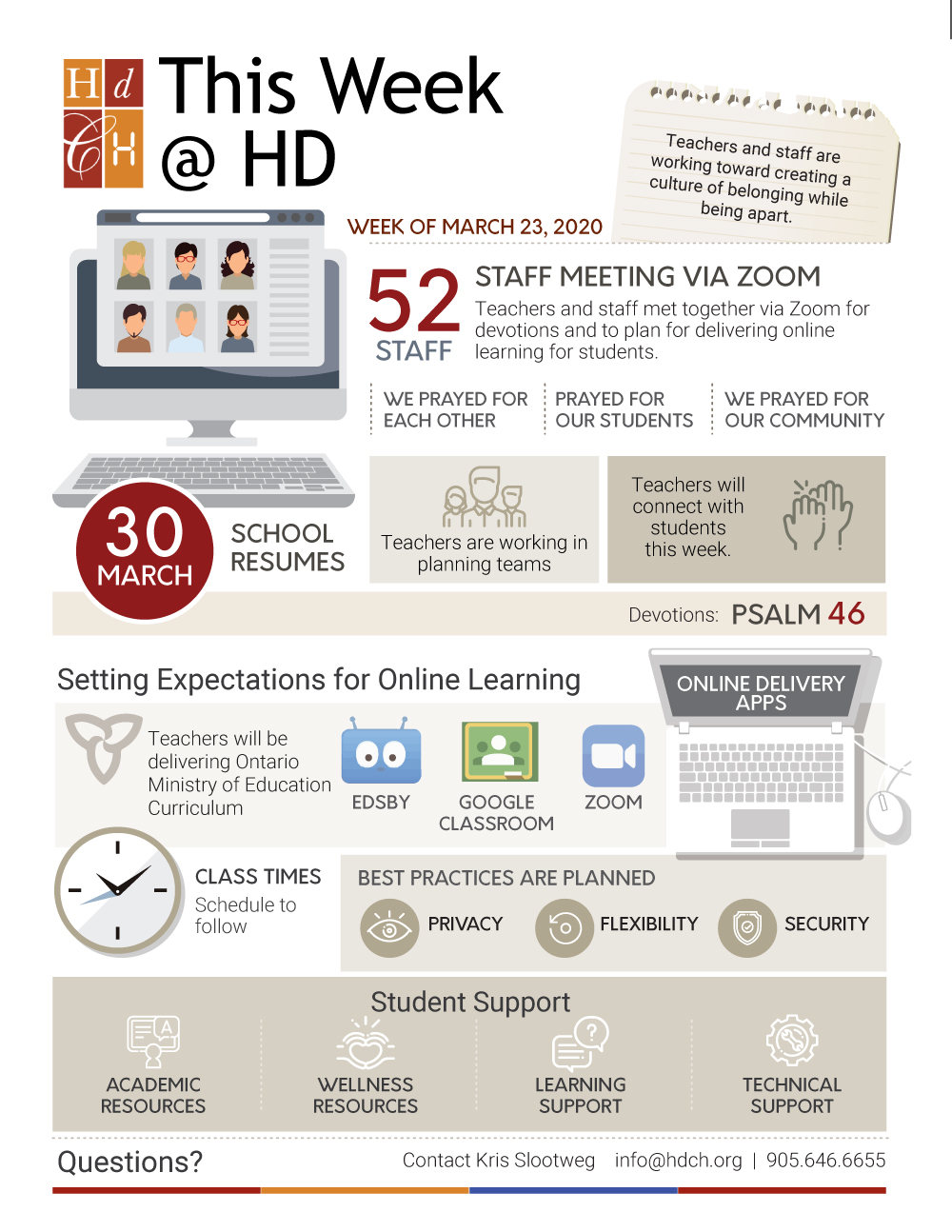 Teachers and staff met together via Zoom for devotions and to plan for delivering online learning for students. We are working toward creating a culture of belonging while being apart. Classes are set to begin again (remotely) on March 30th.