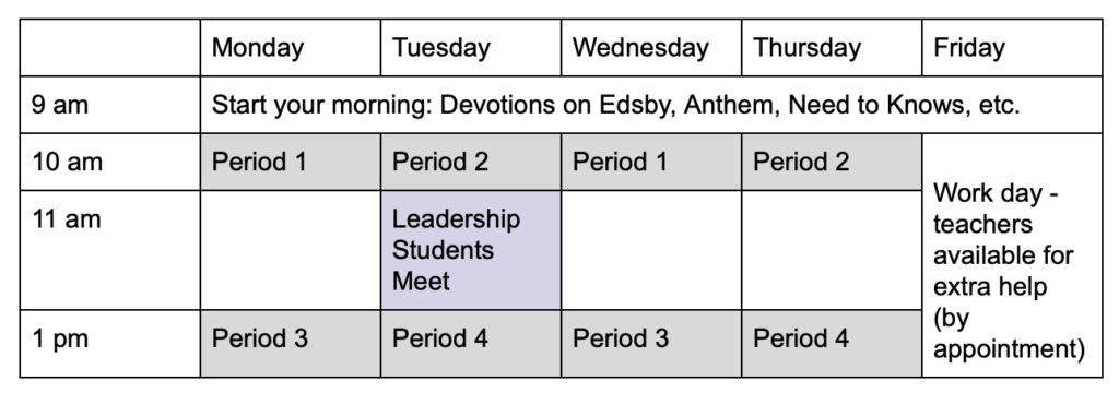 Final words of advice from those who have done online learning: One of the struggles that students have with e-learning is that there isn’t “class time” in the same way, to do work. We want to encourage you to stay up-to-date in your courses each day, using time after class to follow up the lessons. Be prepared to spend a few hours per class each week to stay ahead in your courses. Your teachers will do regular check-ins to support you in achieving daily learning goals.